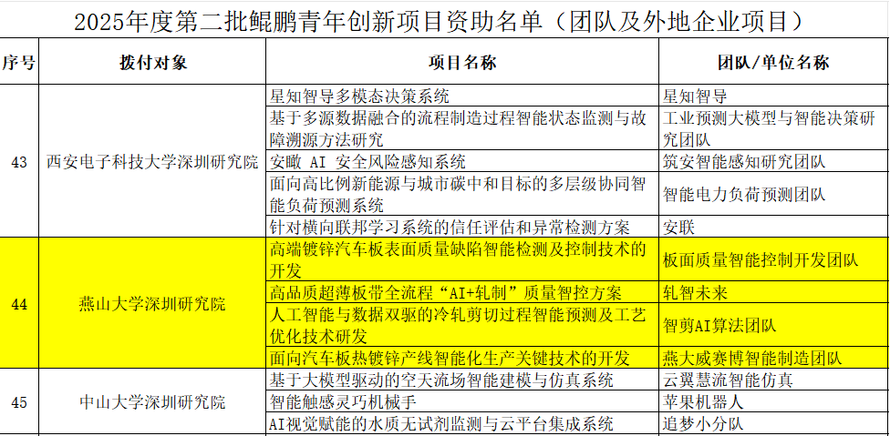 2026年2月6日,深圳市科技创新局正式公布2025年度第二批鲲鹏青年创新项目资助名单,燕山大学深圳研究院再创佳绩:组织申报的5个项目中,4项成功入选,入选率高达80%,充分展现了研究院在青年人才培养与科技创新领域的强劲实力。